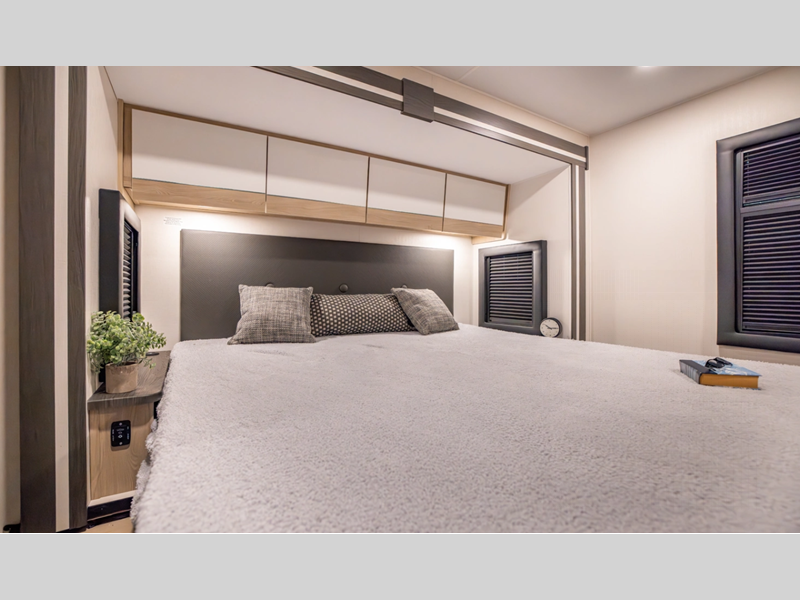 The rear air ride suspension reduces driver fatigue, increases the roll stability, and delivers a consistent vehicle ride height for a smoother ride. Dual 15,000 BTU A/C's with heat pumps will keep you cool on a hot summer day, and the 50 amp service with electric power reel will keep you powered. Fill your bellies with delicious home cooked meals out on the road with the two burner induction cooktop and residential convection microwave!
