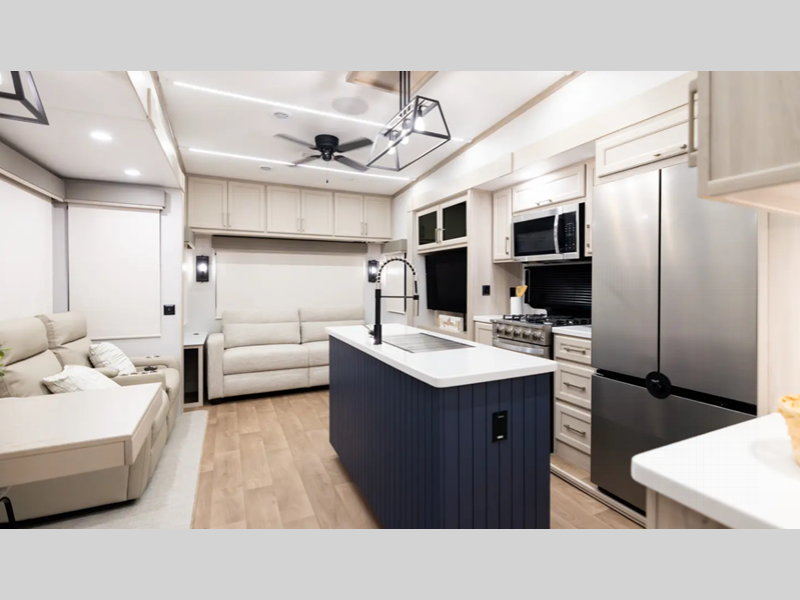 Sleeps 7 Slides 5 Length 42 ft 7 in Ext Width 8 ft 5 in Ext Height 13 ft 6 in Hitch Weight 2785 lbs GVWR 16785 lbs Dry Weight 14664 lbs Cargo Capacity 2121 lbs Fresh Water Capacity 75 gals Grey Water Capacity 78 gals Black Water Capacity 39 gals Tire Size 16" Furnace BTU 35000 btu Number Of Bunks 1 Available Beds King Refrigerator Type 12V Stainless Steel Residential w/Ice Maker Shower Size 48" x 30" Number of Awnings 2 Axle Weight 7000 lbs LP Tank Capacity 30 lbs Water Heater Capacity 12 gal Water Heater Type Quick Recovery AC BTU 45000 btu TV Info LR 50" Smart TV, BR Smart TV Awning Info 13' and 21' Power with LED Lights Axle Count 2 Washer/Dryer Available Yes Number of LP Tanks 2 Shower Type Shower w/Seat Electrical Service 50 amp Similar Floorplans