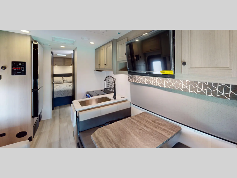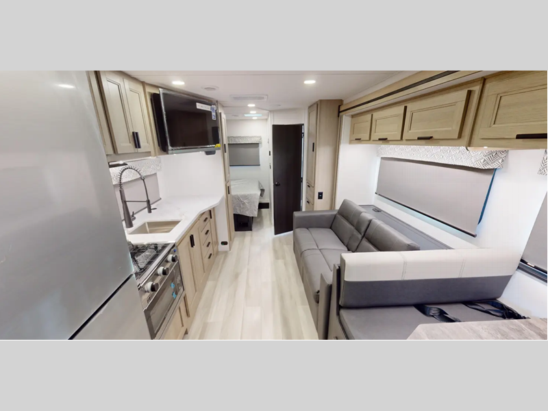 Sleeps 5 Length 29 ft 11 in Ext Width 8 ft 5 in Ext Height 11 ft 3 in Hitch Weight 5000 lbs GVWR 14500 lbs Fresh Water Capacity 44 gals Grey Water Capacity 39 gals Black Water Capacity 39 gals Furnace BTU 30000 btu Generator 4.5KW Gas Fuel Type Gas Chassis Ford E-350 Number Of Bunks 1 Available Beds Queen Refrigerator Type 12V Refrigerator Size 10.7 cu ft Convection Cooking Yes Cooktop Burners 3 Number of Awnings 1 Axle Weight Front 5000 lbs Axle Weight Rear 9600 lbs Water Heater Capacity 6 gal Water Heater Type DSI Gas/Electric AC BTU 15000 btu TV Info LR 12V LED TV Awning Info 18' Power w/LED Light Strip Gross Combined Weight 22000 lbs Shower Type Standard Electrical Service 30 amp Similar Floorplans