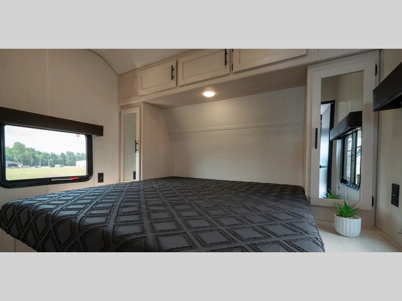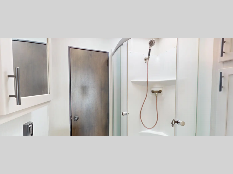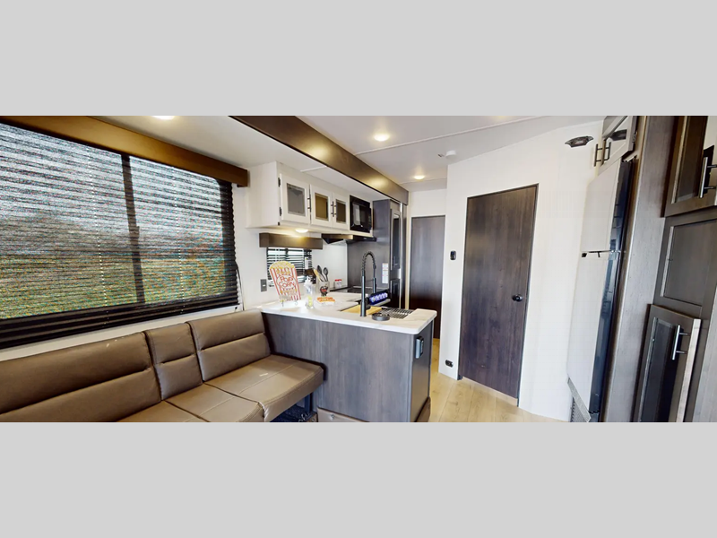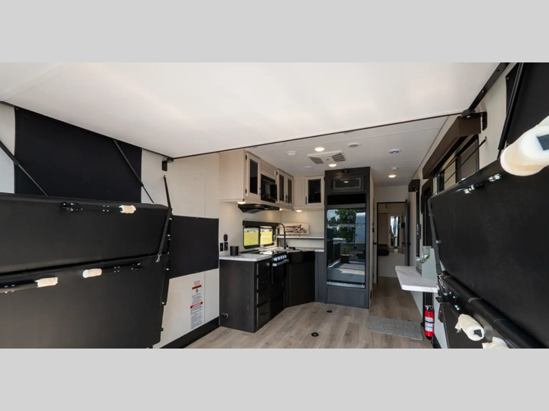 Each model is constructed with an armored underbelly tank enclosure and forced air heat to all holding tanks which will allow you to camp all year long. The outside shower with hot and cold water means you can wash off your toys after trail riding, and the power awning will provide an inviting outdoor space to relax. Inside, you'll enjoy seamless countertops, zebra shades, a tankless on demand water heater, and more convenient features.