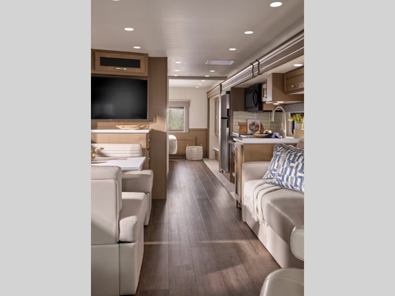 Sleeps 5 Slides 3 Length 32 ft 11 in Ext Width 8 ft 6 in Ext Height 12 ft 4 in Int Height 6 ft 8 in Interior Color Arlo, Stowe, Vista Exterior Color Carolina, Depoe, Traverse Hitch Weight 5000 lbs GVWR 22000 lbs Dry Weight 20050 lbs Cargo Capacity 1950 lbs Fresh Water Capacity 75 gals Grey Water Capacity 60 gals Black Water Capacity 40 gals Furnace BTU 30000 btu Generator 5.5 kW Cummins Onan Fuel Type Gas Engine 7.3L V8 Chassis Ford F-53 Horsepower 335 hp Fuel Capacity 80 gals Wheelbase 220 in Available Beds King Torque 468 ft-lb Refrigerator Type Norcold Refrigerator Size 8 cu ft Cooktop Burners 3 Shower Size 40" x 30" Axle Weight Front 8000 lbs Axle Weight Rear 15000 lbs LP Tank Capacity 25 gals Water Heater Capacity 6 gal Water Heater Type Gas/Electric with Electric Ignition AC BTU 27000 btu TV Info LR Samsung LED TV Lift, BR 32" LED Awning Info Carefree Travel'R Side Awning with LED Lighting Gross Combined Weight 26000 lbs Shower Type Standard Electrical Service 30 amp Similar Floorplans