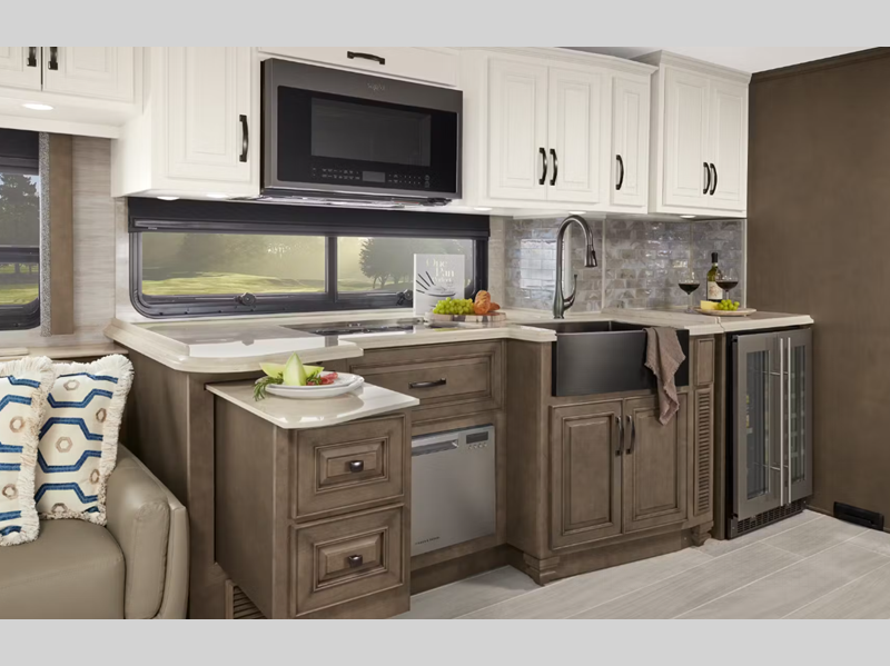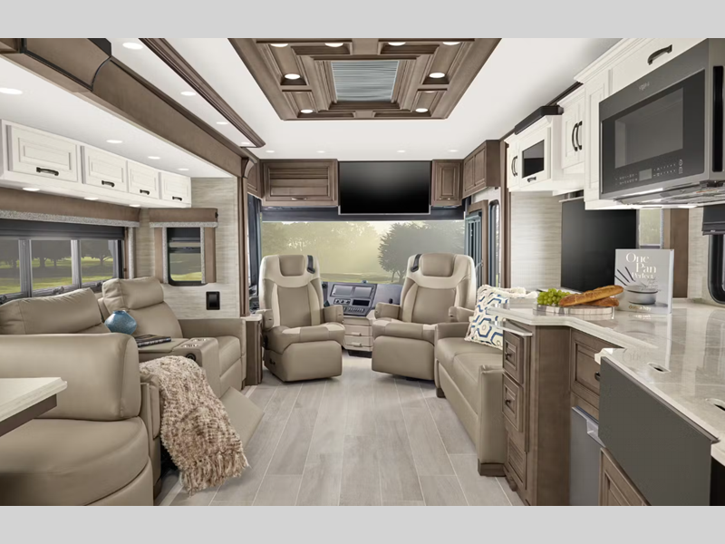 The exterior full-paint Masterpiece Finish is an industry exclusive, and it will attract every eye on the road. These luxurious coaches are absolutely filled to the brim with enticing amenities, like the convection microwave, Samsung LED TV, Bose sound bar sound system, and Xite dash radio with 9" monitors. There is also a Nav-N-Go navigation system, Villa Comfort Fit furniture, plush pillowtop mattress, and wireless phone charging mat.