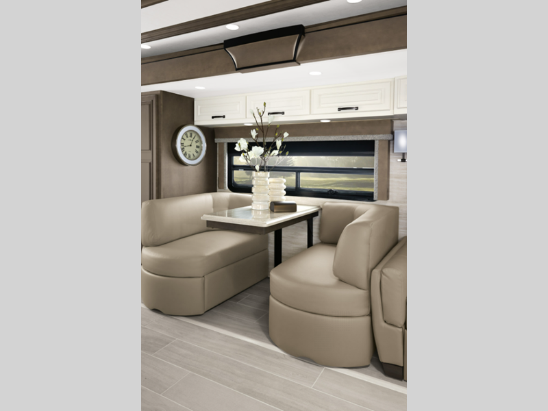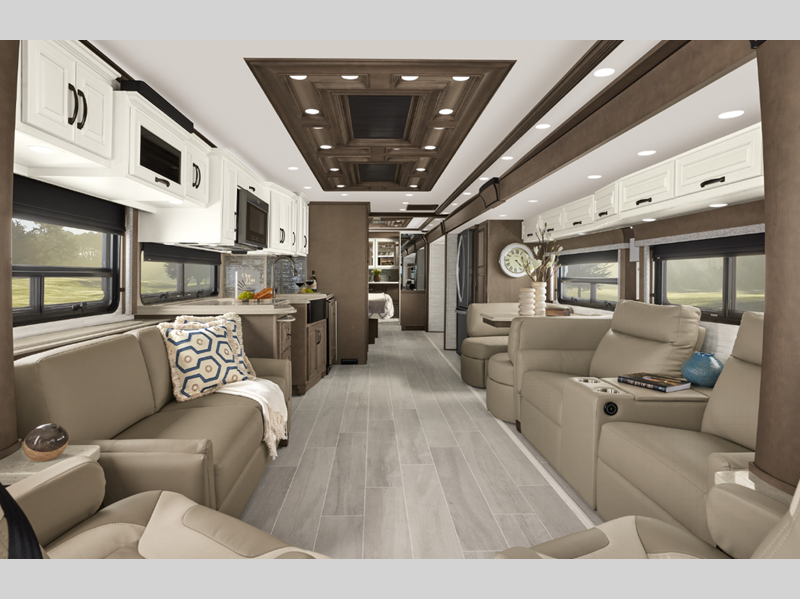 Sleeps 5 Slides 3 Length 43 ft 9 in Ext Width 8 ft 6 in Ext Height 13 ft 1 in Int Height 6 ft 11 in Interior Color Alora, Bayshore, Catalina, Stratton Exterior Color Champagne, Salsa, Seaspray, Steely Hitch Weight 15000 lbs GVWR 51000 lbs Dry Weight 40000 lbs Cargo Capacity 11000 lbs Fresh Water Capacity 105 gals Grey Water Capacity 75 gals Black Water Capacity 55 gals Furnace BTU 50000 btu Generator 10.0 Kw Onan Fuel Type Diesel Engine Cummins 8.9L Chassis Freightliner Tag Axle Horsepower 450 hp Fuel Capacity 150 gals Wheelbase 288 in Available Beds King Torque 1250 ft-lb Refrigerator Type Whirlpool Refrigerator Size 19.7 cu ft Convection Cooking Yes Cooktop Burners 3 Shower Size 50" x 34" Number of Awnings 1 Axle Weight Front 19000 lbs Axle Weight Rear 20000 lbs Axle Weight Tag 12000 lbs LP Tank Capacity 22 gals Water Heater Type Demand AC BTU 45000 btu TV Info LR Samsung LED TV, BR Samsung LED TV Awning Info Girard® G2000 power with wind sensor, remote control & LED lights Washer/Dryer Available Yes Gross Combined Weight 66000 lbs Shower Type Shower w/Seat Electrical Service 50 amp Similar Floorplans