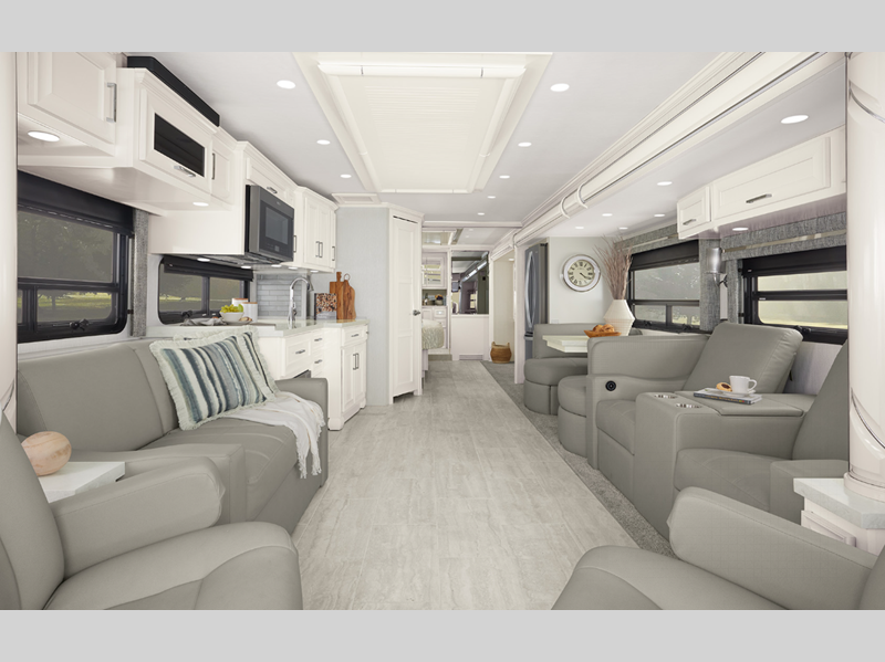 Sleeps 5 Slides 3 Length 43 ft 10 in Ext Width 8 ft 6 in Ext Height 13 ft 1 in Int Height 6 ft 11 in Interior Color Brighton, Palisades, Saguaro Exterior Color Cider, Ebony, Sky Hitch Weight 15000 lbs GVWR 45600 lbs Dry Weight 36950 lbs Cargo Capacity 8650 lbs Fresh Water Capacity 105 gals Grey Water Capacity 75 gals Black Water Capacity 55 gals Furnace BTU 50000 btu Generator 8.0 kW Cummins Onan Diesel Quiet Series Fuel Type Diesel Engine Cummins L 8.9 Chassis Freightliner XCR Tag Axle Horsepower 400 hp Fuel Capacity 100 gals Wheelbase 281 in Available Beds King Torque 1250 ft-lb Refrigerator Type Whirlpool Refrigerator Size 19.7 cu ft Convection Cooking Yes Cooktop Burners 2 Shower Size 50" x 34" Number of Awnings 1 Axle Weight Front 15600 lbs Axle Weight Rear 20000 lbs Axle Weight Tag 10000 lbs Water Heater Type Continuous AC BTU 45000 btu TV Info LR 50" Samsung LED 4K TV on Televator, BR Samsung LED 4K Awning Info Girard G2000 Power w/Wind Sensor, Remote, and LED Lights Washer/Dryer Available Yes Gross Combined Weight 60600 lbs Shower Type Shower w/Seat Electrical Service 50 amp Similar Floorplans