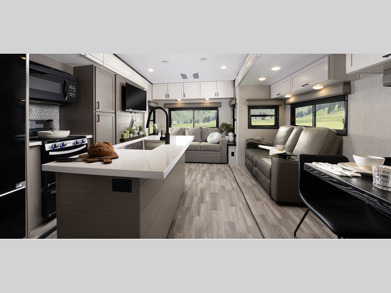 Sleeps 4 Slides 3 Length 32 ft 8 in Ext Width 8 ft 4 in Ext Height 12 ft 5 in Int Height 8 ft 6 in Interior Color Washed Driftwood Hitch Weight 1790 lbs GVWR 11800 lbs Dry Weight 9735 lbs Cargo Capacity 2065 lbs Fresh Water Capacity 75 gals Grey Water Capacity 97 gals Black Water Capacity 40 gals Tire Size ST235/80R16'E Furnace BTU 30000 btu Available Beds Queen Refrigerator Type 12V Refrigerator Size 17 cu ft Cooktop Burners 3 Number of Awnings 1 LP Tank Capacity 20 lbs. Water Heater Capacity 6 gal Water Heater Type Quick Recovery Gas/Electric AC BTU 15000 btu TV Info LR 40" Smart HDTV Awning Info 16' Power with LED lighting Axle Count 2 Washer/Dryer Available Yes Number of LP Tanks 3 Shower Type Standard Electrical Service 50 amp Similar Floorplans